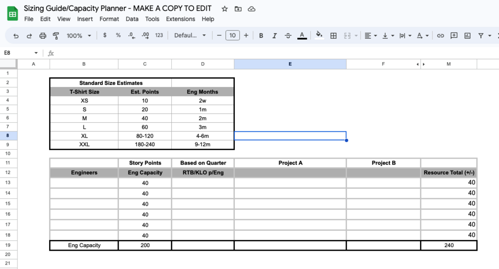This will allow you to gauge capacity correctly including PTO/KLO/On Call hours into the engineer/employee capacity for the quarter/year. There are sizing guides included for whatever you work with: t shirt sizes, point or eng month/hours. Fully customizable and easy. The google sheets formulas are all set for you to add this directly to your Roadmap Plan, or otherwise.